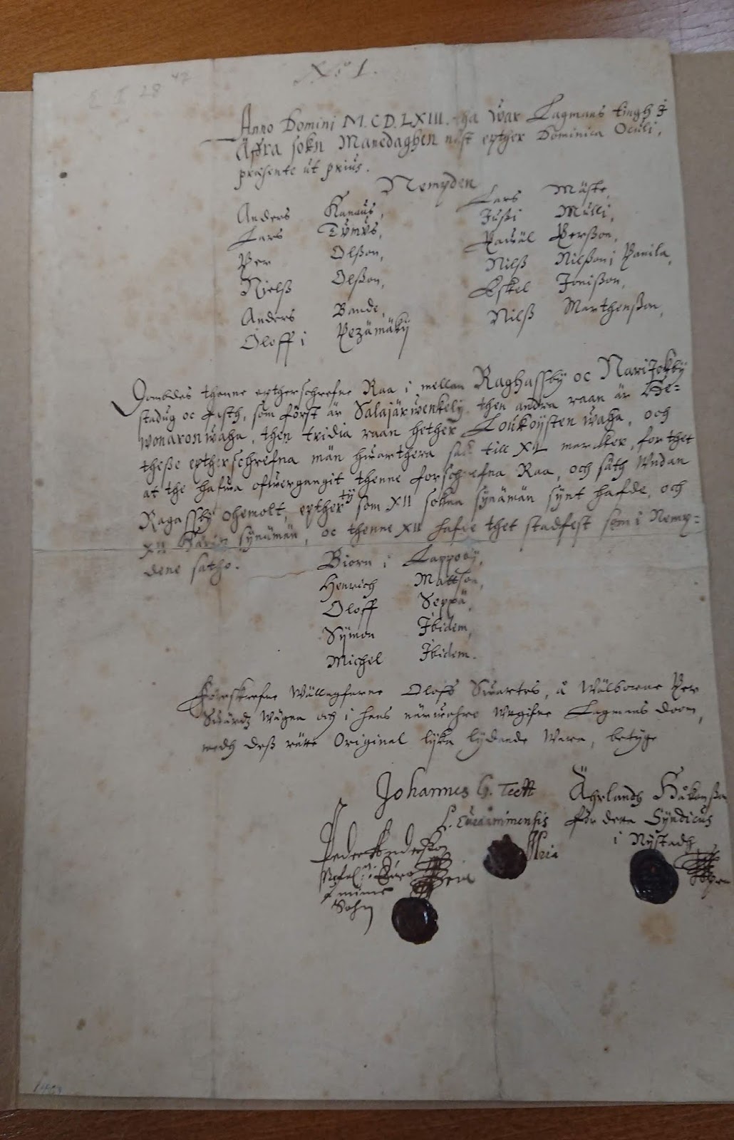 Otsikon mukaan alkuperäinen asiakirja on kirjoitettu laamanninkäräjillä 3. paastonajan sunnuntain jälkeisenä maanantaina 1463. Itse tekstistä lautamiesten listan jälkeen saan tolkkua sen verran, että kyse on Rahvolan(?) ja Naarajoen välisestä rajasta. Naarajoen kylä ei ole Eurajoella vaan Eurassa. Suvannon henkilötietokannasta (pdf) löytyy Naarajoen kohdalta tieto, että laamanni Hartvik Jaakonpoika oli 14.9.1463 päivännyt tuomiokirjeen, jolla tilaan oli liitetty eräs ulkopalsta. Eli kyse on eri asiasta, mutta yhdessä keväiseen päätökseen syntyy mielikuva uudesta isännästä, joka ajaa aktiivisesti etujaan.