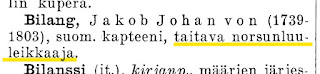 Jacob Johan Bilang vietti suurimman osan elämästään Suomen ulkopuolella, mutta hän oli syntynyt Haapavedellä ja kuoli Helsingissä, joten suomalaisuus kestää peruskriittisen tarkastelun. Sen sijaan ensimmäinen vaimonsa Catharina Emerentia Scheding oli syntyjään Norrköpingistä ja avioliitossa vuonna 1777 syntynyt tytär Johanna todennäköisesti ei asunut koskaan Suomessa. Mikä on sääli, sillä hän oli Ihan Oikea Miniatyyritaiteilija.