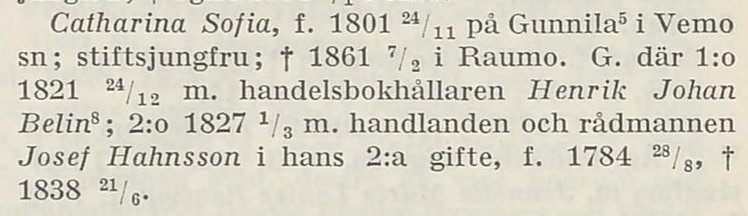 Ehei. Avaamalla Rauman vihityt selvisi, että Elgenstierna oli saanut Rauman seurakunnasta virheellistä tietoa. Henrik Johan Belin (s. 1796) meni 24.12.1821 naimisiin Ulrika Charlotta Hillebrandin (s. 1775, o. s. Timen) kanssa (RK Rauma 1820-1827, N:o 171 Randuoti). Ulrika oli vaihtanut reippaasti nuorempaan malliin, sillä aiempi aviomiehensä Edward Lorentz Hillebrand kuoli 85-vuotiaana 5.2.1818.